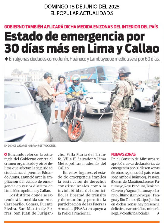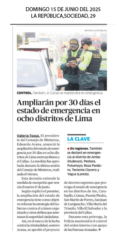 El presidente del Consejo de Ministros, Eduardo Arana, anunció que el Gobierno ha aprobado una nueva prórroga del estado de emergencia por 30 días adicionales en ocho distritos de Lima Metropolitana y en toda la Provincia Constitucional del Callao.
