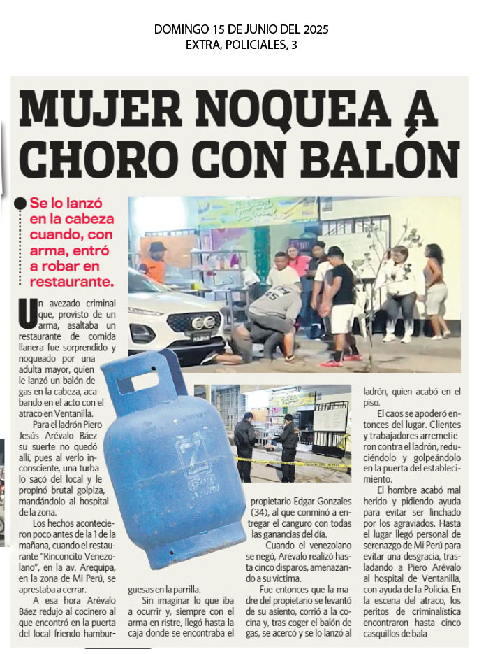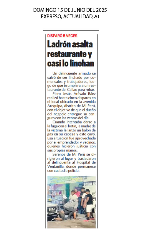 Un delincuente armado se salvo de ser linchado por comensales y trabajadores, luego que irrumpiera a un restaurante del Callao para robar. Piero Jesús Arévalo Báez realizó hasta cinco disparos en el local ubicado en la avenida Arequipa, distrito de Mi Perú.