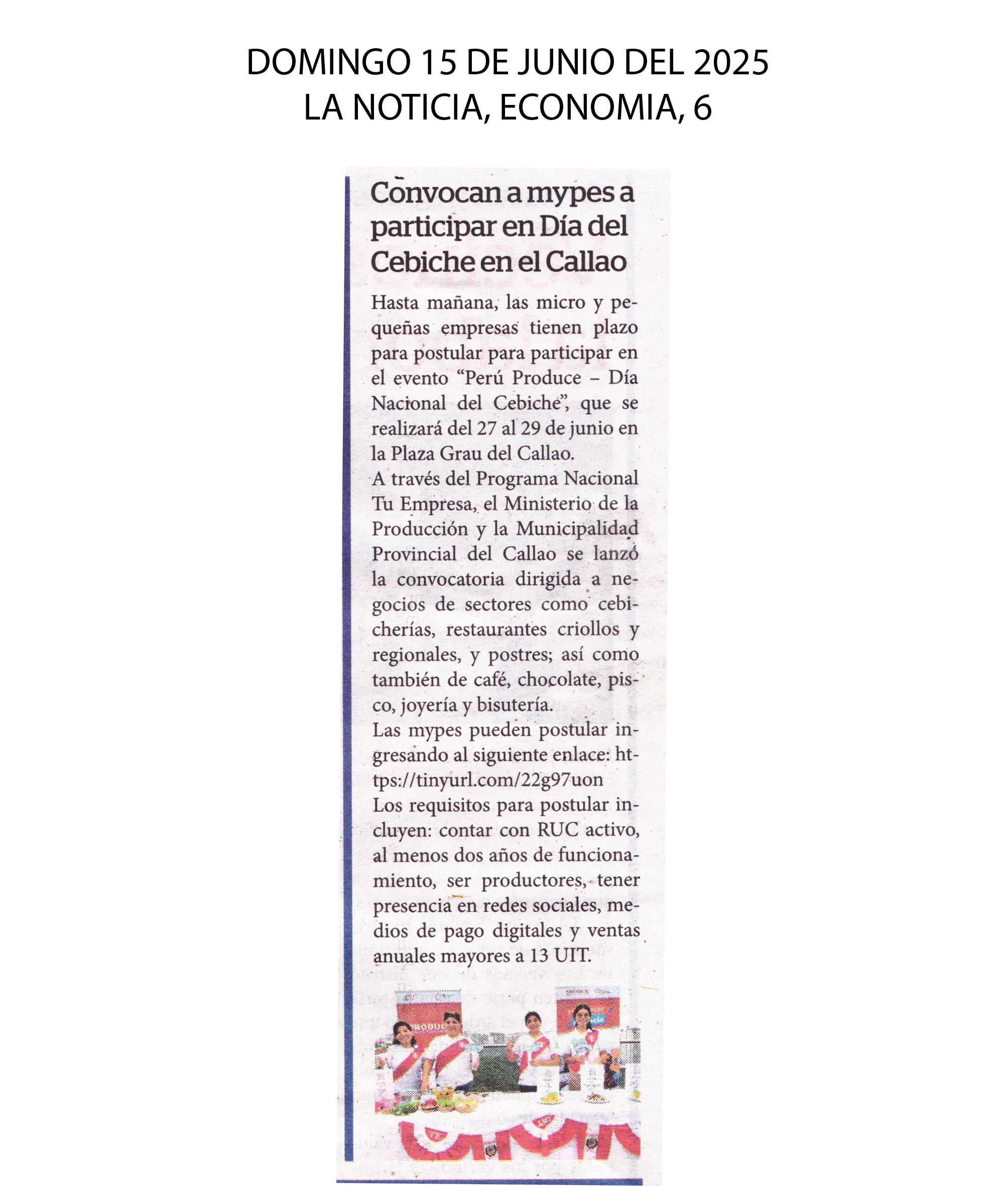 Hasta mañana, las micro y pequeñas empresas tienen plazo para postular para participar en el evento "Perú Produce - Día Nacional del Cebiche", que se realizará del 27 al 29 de junio en la Plaza Grau del Callao y que organizado por el Programa Nacional Tu Empresa, el Ministerio de la Producción y la Municipalidad Provincial del Callao.