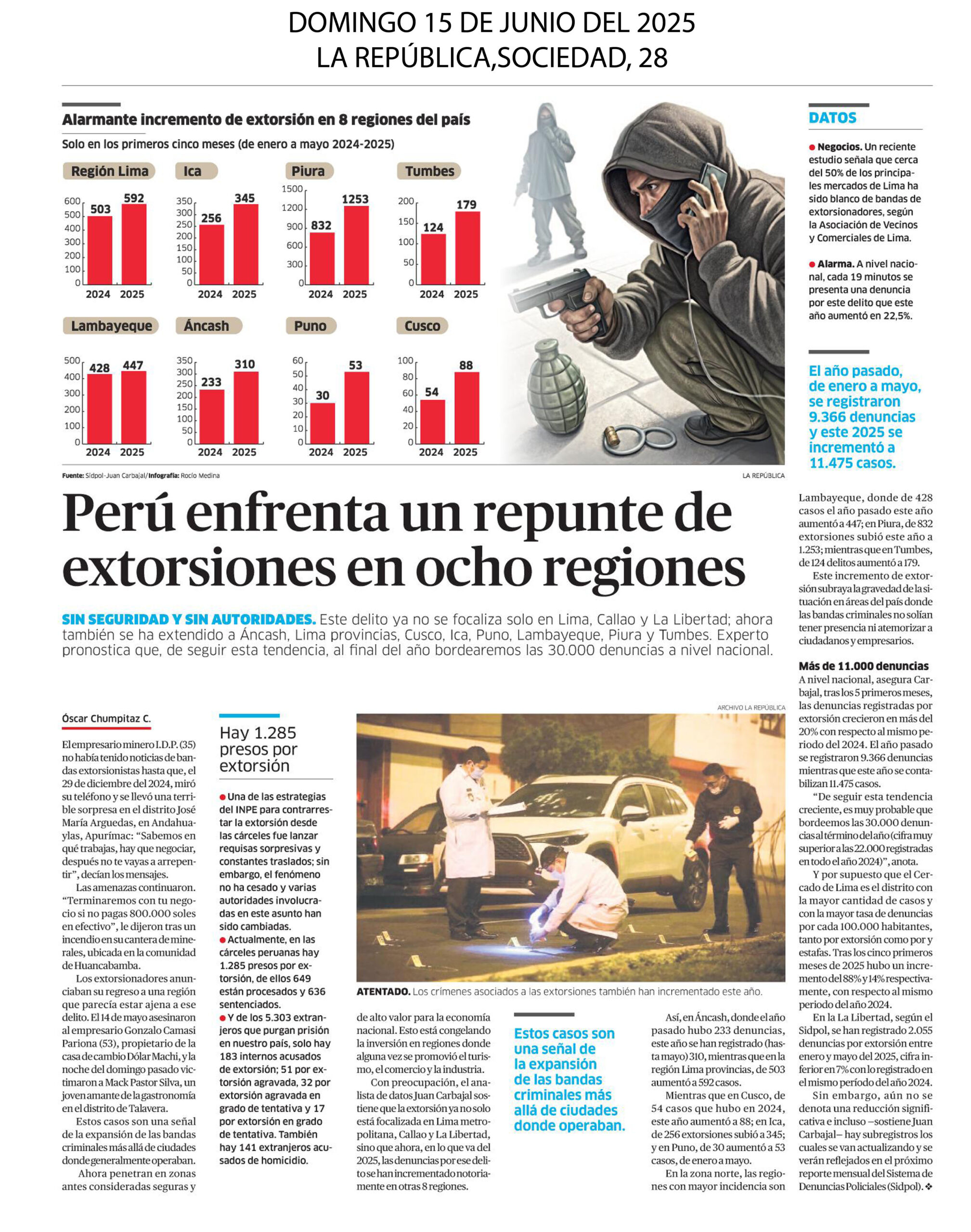 Perú enfrenta un repunte de extorsiones en ocho regiones