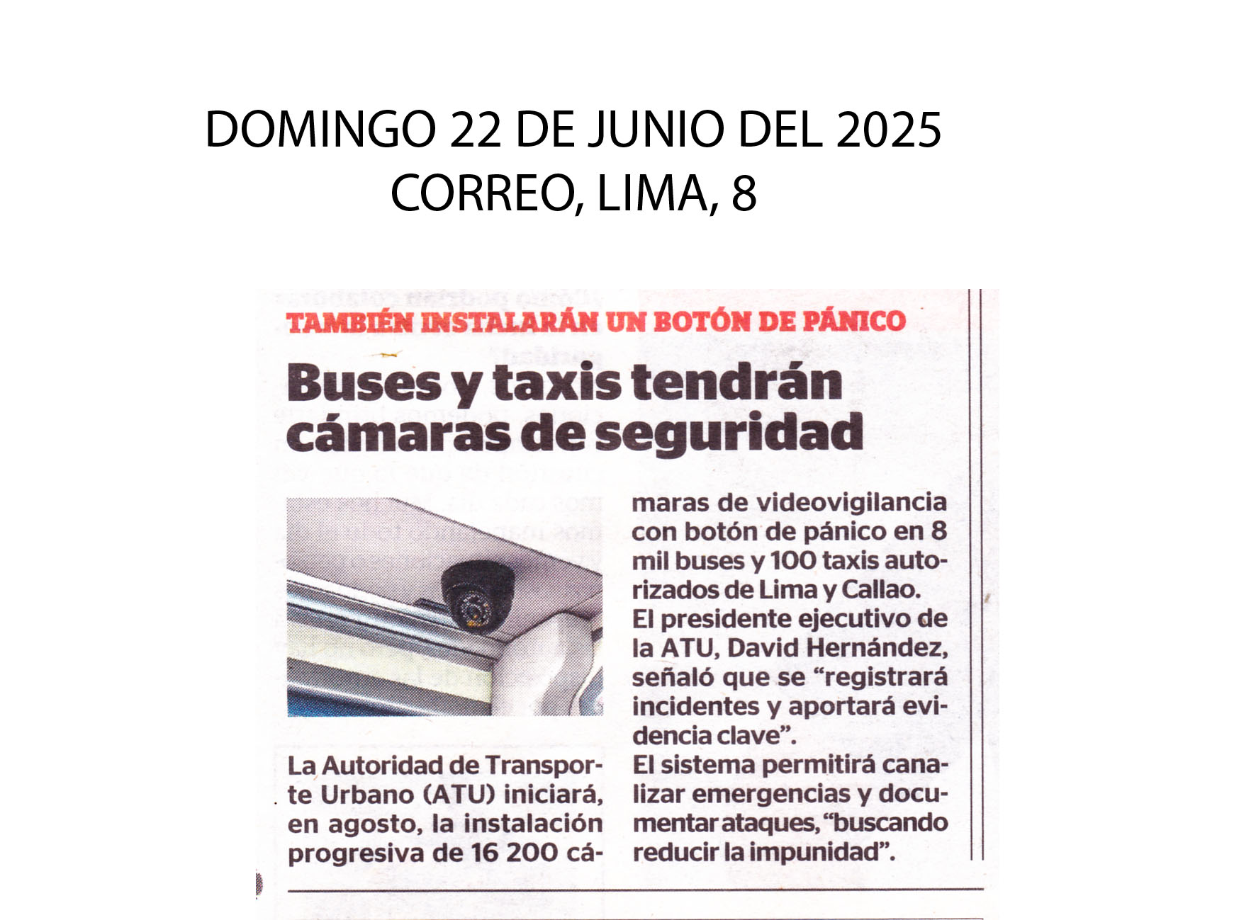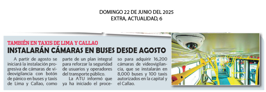 La Autoridad de Transpore Urbano (ATU) iniciará, en agosto, la instalación progresiva de 16200 cámaras de videovigilancia con botón de pánico en 8 mil buses y 100 taxis autorizados de Lima y Callao.