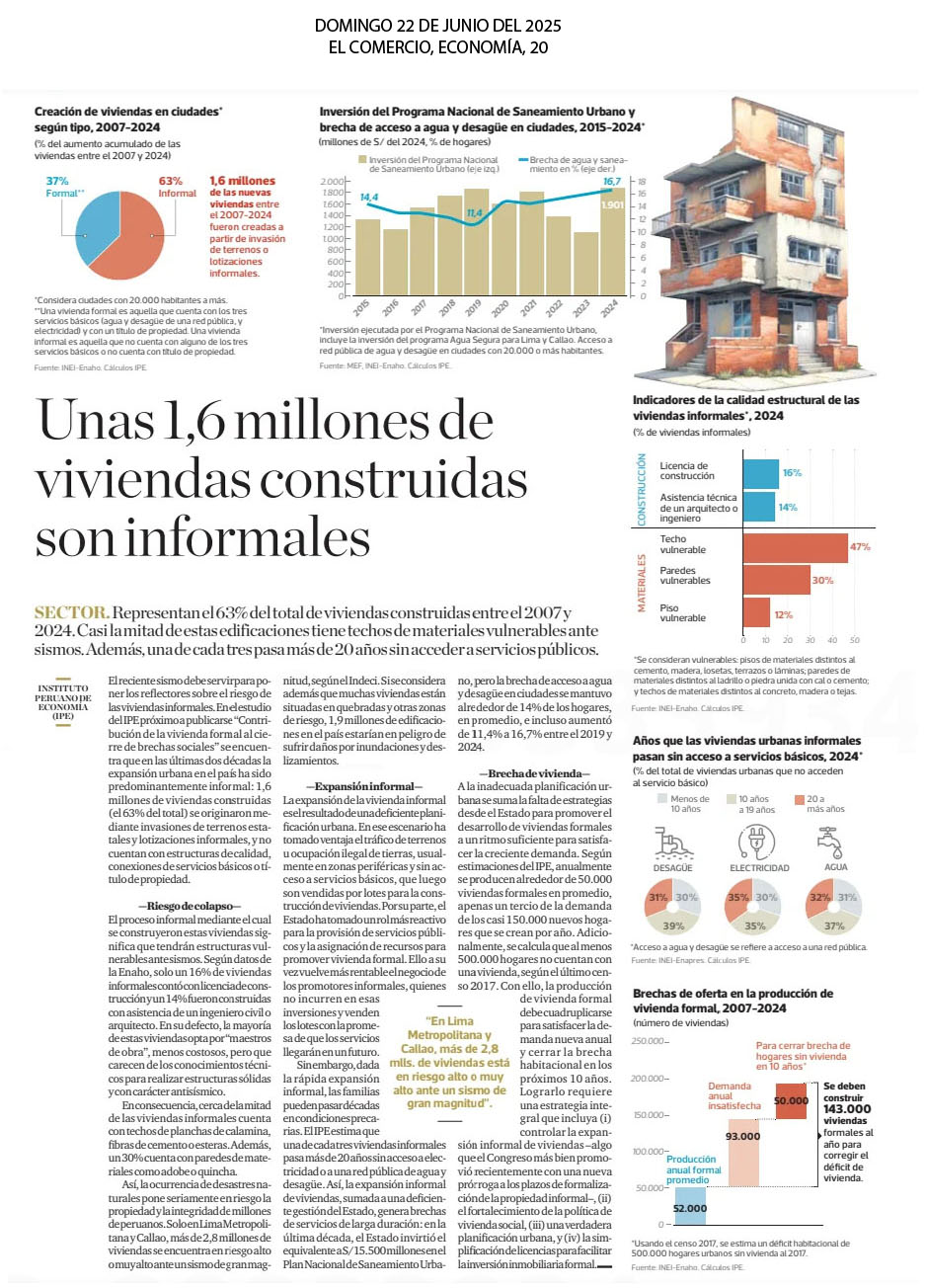 Según cifras de la Enaho (Encuesta Nacional de Hogares), sólo un 16% de viviendas informales contó con licencia de construcción y un 14% fueron construidas con asistencia de un ingeniero civil o arquitecto. En ese sentido y ante la ocurrencia de desastres naturales pone seriamente en riesgo la propiedad e integridad de millones de peruanos. Solo en Lima Metropolitana y Callao, más de 2,8 millones de viviendas se encuentran en riesgo alto o muy alto ante un sismo de gran magnitud, según el Indeci. Por otro lado, el IPE (Instituto Peruano de Economía) estima que cada de tres viviendas informales pasan más de 20 años sin acceso a electricidad o una red pública de agua y desagüe. En la última década, el Estado invirtió el equivalente a S/ 15.500 millones en el Plan Nacional de Saneamiento Urbano, pero la brecha de acceso a agua y desagüe en ciudades se mantuvo alrededor de 14% de los hogares, en promedio, e incluso aumentó de 11,4% a 16,7% entre el 2019 y 2024.