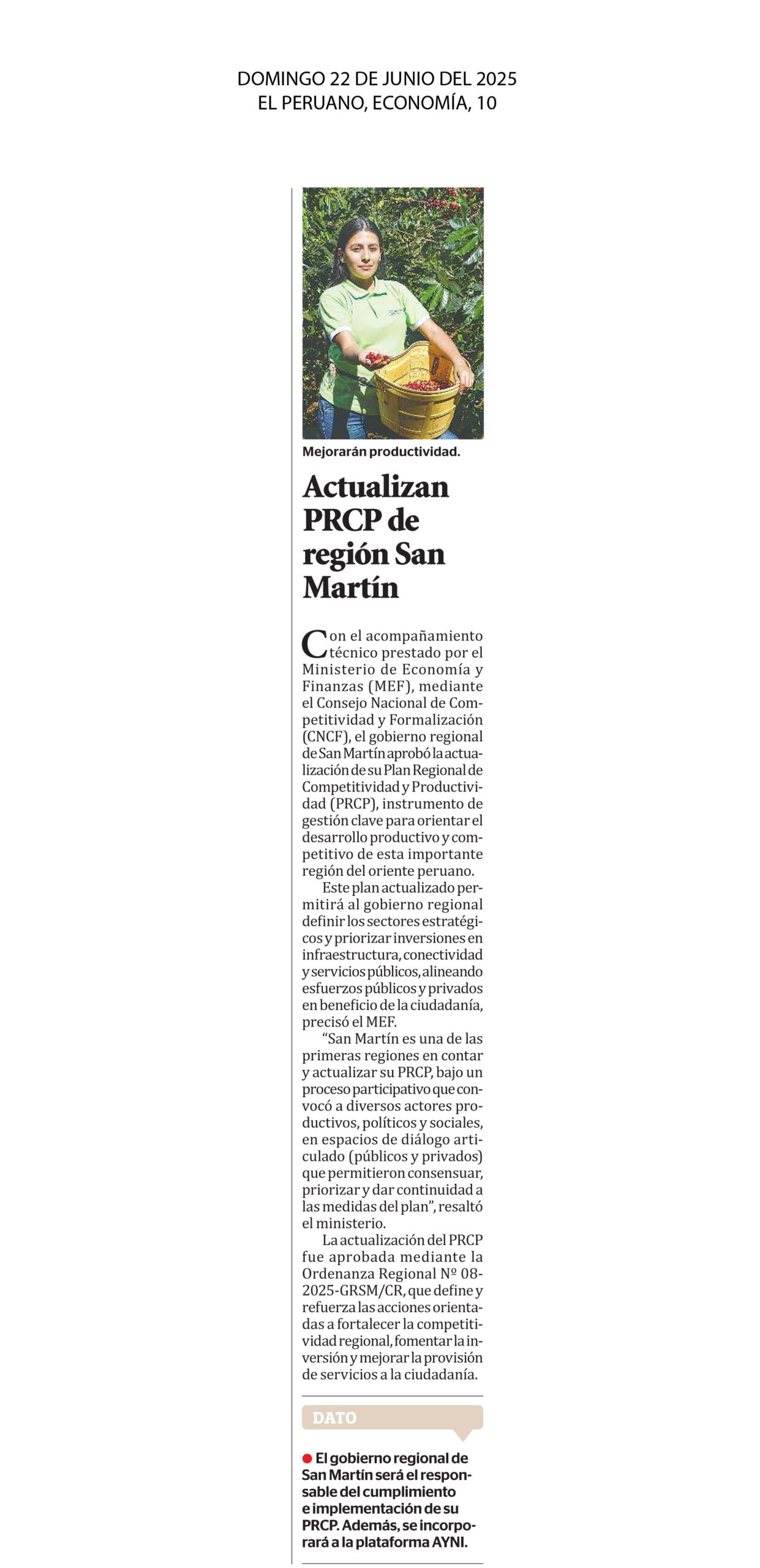 Con el acompañamiento técnico prestado por el Ministerio de Economía y Finanzas (MEF), mediante el Consejo Nacional de Competitividad y Formalización (CNCF), el gobierno regional de San Martín aprobó la actualización de su Plan Regional de Competitividad y Productividad (PRCP), instrumento de gestión clave para orientar el desarrollo productivo y competitivo de esta importante región del oriente peruano. Este plan actualizado permitirá al gobierno regional definir los sectores estratégicos y priorizar inversiones en infraestructura, conectividad y servicios públicos, alineando esfuerzos públicos y privados en beneficio de la ciudadanía, precisó el MEF.