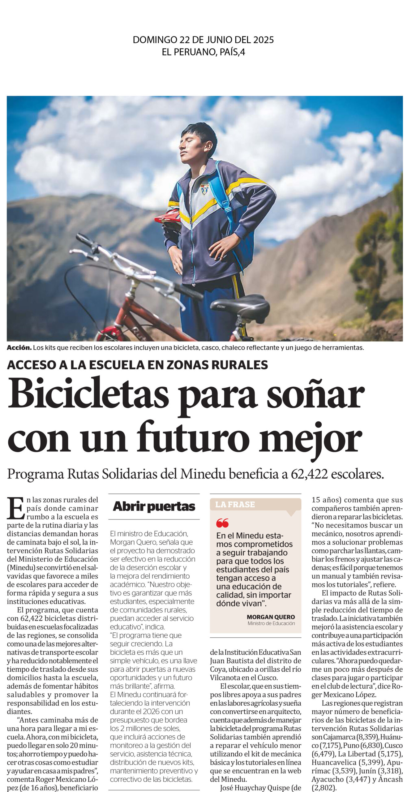 En las zonas rurales del país donde caminar rumbo a la escuela es parte de la rutina diaria y las distancias demandan horas de caminata bajo el sol, la intervención Rutas Solidarias del Ministerio de Educación (Minedu) se convirtió en el salvavidas que favorece a miles de escolares para acceder de forma rápida y segura a sus instituciones educativas. El programa, que cuenta con 62,422 bicicletas distribuidas en escuelas focalizadas de las regiones, se consolida como una de las mejores alternativas de transporte escolar. Las regiones que registran mayor número de beneficiarios de las bicicletas de la intervención Rutas Solidarias son Cajamarca (8,359), Huánuco (7,175), Puno (6,830), Cusco (6,479), La Libertad (5,175), Huancavelica (5,399), Apurímac (3,539), Junín (3,318), Ayacucho (3,447) y Áncash (2,802).