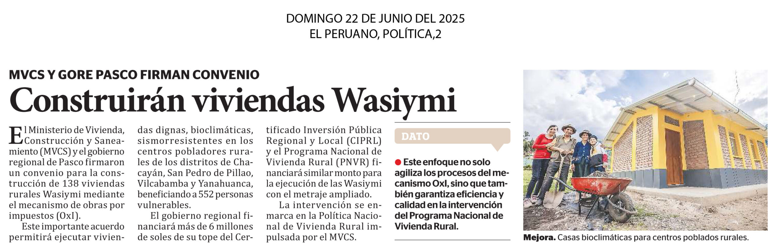 El Ministerio de Vivienda, Construcción y Saneamiento (MVCS) y el gobierno regional de Pasco firmaron un convenio para la construcción de 138 viviendas rurales Wasiymi mediante el mecanismo de obras por impuestos (OxI). Este importante acuerdo permitirá ejecutar viviendas dignas, bioclimáticas, sismorresistentes en los centros pobladores rurales de los distritos de Chacayán, San Pedro de Pillao, Vilcabamba y Yanahuanca, beneficiando a 552 personas vulnerables. El gobierno regional financiará más de 6 millones de soles de su tope del Certificado Inversión Pública Regional y Local (CIPRL) y el Programa Nacional de Vivienda Rural (PNVR) financiará similar monto para la ejecución de las Wasiymi con el metraje ampliado.