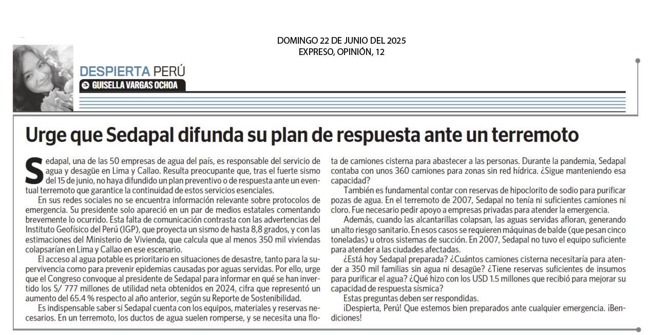 Artículo escrito por Guisella Vargas Ochoa. "Sedapal, una de las 50 empresas de agua del país, es responsable del servicio de agua y desagüe en Lima y Callao. Resulta preocupante que, tras el fuerte sismo del 15 de junio, no haya difundido un plan preventivo o de respuesta ante un eventual terremoto que garantice la continuidad de estos servicios esenciales. En sus redes sociales no se encuentra información relevante sobre protocolos de emergencia. Su presidente solo apareció en un par de medios estatales comentando brevemente lo ocurrido. Esta falta de comunicación contrasta con las advertencias del Instituto Geofísico del Perú (IGP), que proyecta un sismo de hasta 8,8 grados, y con las estimaciones del Ministerio de Vivienda, que calcula que al menos 350 mil viviendas colapsarían en Lima y Callao en ese escenario...".