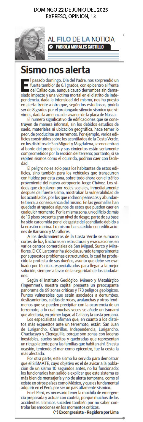 Artículo de Fabiola Morales Castro (Excongresista-Regidora de Lima). "El pasado domingo, Día del Padre, nos sorprendió un fuerte temblor de 6.1 grados, con epicentro al frente del Callao que, aunque causó derrumbes sin demasiado impacto y una víctima mortal en el distrito de Independencia, dada la intensidad del mismo, nos ha puesto en alerta frente a otro que, según los estudiosos, podría ser de 8 grados por el prolongado silencio sísmico que vivimos, dada la amenaza del avance de la placa de Nasca (...) Según el Instituto Geológico, Minero y Metalúrgico (Ingemmet), nuestra capital presenta un preocupante panorama de 69 zonas críticas y 173 peligros geológicos. Puntos vulnerables que están asociados a derrumbes, deslizamientos, caídas de rocas, avalanchas y otros fenómenos que se pueden precipitar con la ocurrencia de un terremoto, a lo cual muchas veces se añade un tsunami que afectaría, en primer lugar, al Callao y la costa peruana...".