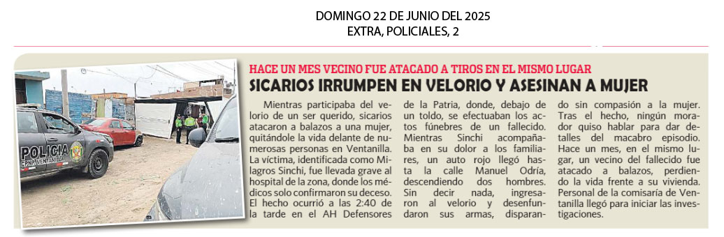 Mientras participaba del velorio de un ser querido, sicarios atacaron a balazos a una mujer, quitándole la vida delante de numerosas personas en Ventanilla. La víctima, identificada como Milagros Sinchi, fue llevada grave al hospital de la zona, donde los médicos solo confirmaron su deceso. El hecho ocurrió a las 2:40 de la tarde en el AH Defensores de la Patria, donde, debajo de un toldo, se efectuaban los actos fúnebres de un fallecido.