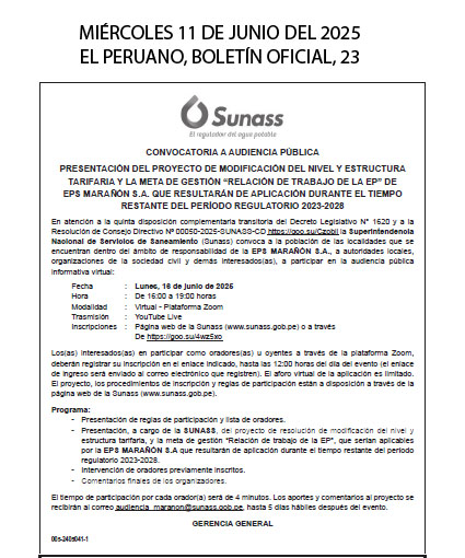 Sunass: convocatoria a audiencia pública EPS Marañón La Superintendencia Nacional de Servicios de Saneamiento (Sunass) convoca a la población de las localidades que se encuentran dentro del ámbito de responsabilidad de la EPS MARAÑÓN S.A., a autoridades locales, organizaciones de la sociedad civil y demás interesados(as), a participar en la audiencia pública informativa virtual para la PRESENTACIÓN DEL PROYECTO DE MODIFICACIÓN DEL NIVEL Y ESTRUCTURA TARIFARIA Y LA META DE GESTIÓN “RELACIÓN DE TRABAJO DE LA EP” DE EPS MARAÑÓN S.A. QUE RESULTARÁN DE APLICACIÓN DURANTE EL TIEMPO RESTANTE DEL PERÍODO REGULATORIO 2023-2028. La cual se llevará a cabo el lunes 16 de junio de 2025. El Peruano, Boletín Oficial, 23