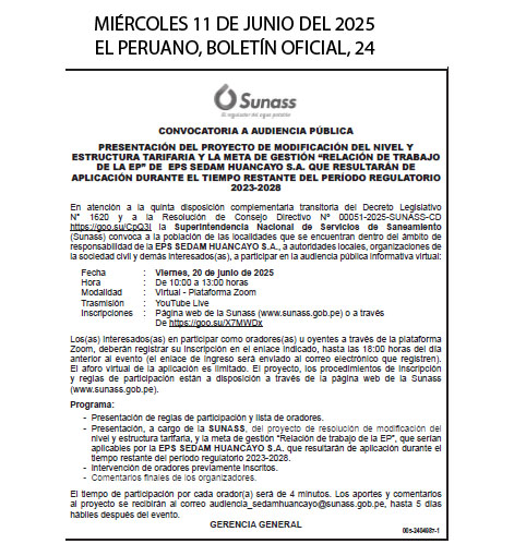 Sunass: convocatoria a audiencia pública SEDAM HUANCAYO S.A. La Superintendencia Nacional de Servicios de Saneamiento (Sunass) convoca a la población de las localidades que se encuentran dentro del ámbito de responsabilidad de la EPS MARAÑÓN S.A., a autoridades locales, organizaciones de la sociedad civil y demás interesados(as), a participar en la audiencia pública informativa virtual para la PRESENTACIÓN DEL PROYECTO DE MODIFICACIÓN DEL NIVEL Y ESTRUCTURA TARIFARIA Y LA META DE GESTIÓN “RELACIÓN DE TRABAJO DE LA EP” DE EPS SEDAM HUANCAYO S.A. QUE RESULTARÁN DE APLICACIÓN DURANTE EL TIEMPO RESTANTE DEL PERÍODO REGULATORIO 2023-2028. La cual se llevará a cabo el viernes 20 de junio de 2025 El Peruano, Boletín Oficial, 24