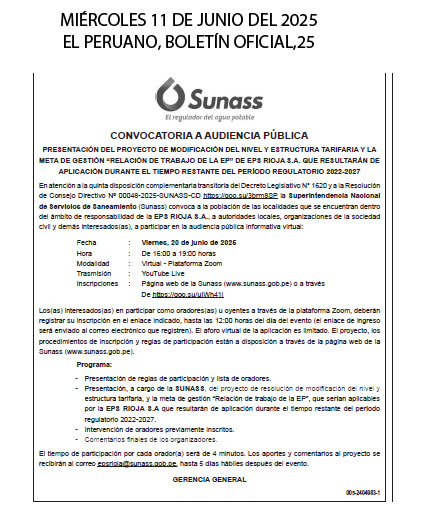 Sunass: convocatoria a audiencia pública EPS RIOJA S.A. La Superintendencia Nacional de Servicios de Saneamiento (Sunass) convoca a la población de las localidades que se encuentran dentro del ámbito de responsabilidad de la EPS MARAÑÓN S.A., a autoridades locales, organizaciones de la sociedad civil y demás interesados(as), a participar en la audiencia pública informativa virtual para la PRESENTACIÓN DEL PROYECTO DE MODIFICACIÓN DEL NIVEL Y ESTRUCTURA TARIFARIA Y LA META DE GESTIÓN “RELACIÓN DE TRABAJO DE LA EP” DE EPS RIOJA S.A. QUE RESULTARÁN DE APLICACIÓN DURANTE EL TIEMPO RESTANTE DEL PERÍODO REGULATORIO 2022-2027. La cual se llevará a cabo el viernes 20 de junio de 2025. El Peruano, Boletín Oficial, 25