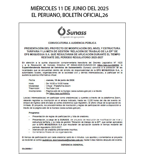 Sunass: convocatoria a audiencia pública EPS MOQUEGUA S.A. La Superintendencia Nacional de Servicios de Saneamiento (Sunass) convoca a la población de las localidades que se encuentran dentro del ámbito de responsabilidad de la EPS MARAÑÓN S.A., a autoridades locales, organizaciones de la sociedad civil y demás interesados(as), a participar en la audiencia pública informativa virtual para la PRESENTACIÓN DEL PROYECTO DE MODIFICACIÓN DEL NIVEL Y ESTRUCTURA TARIFARIA Y LA META DE GESTIÓN “RELACIÓN DE TRABAJO DE LA EP” DE EPS MOQUEGUA S.A. QUE RESULTARÁN DE APLICACIÓN DURANTE EL TIEMPO RESTANTE DEL PERÍODO REGULATORIO 2023-2027. La cual se llevará a cabo el jueves 19 de junio de 2025 El Peruano, Boletín Oficial, 26