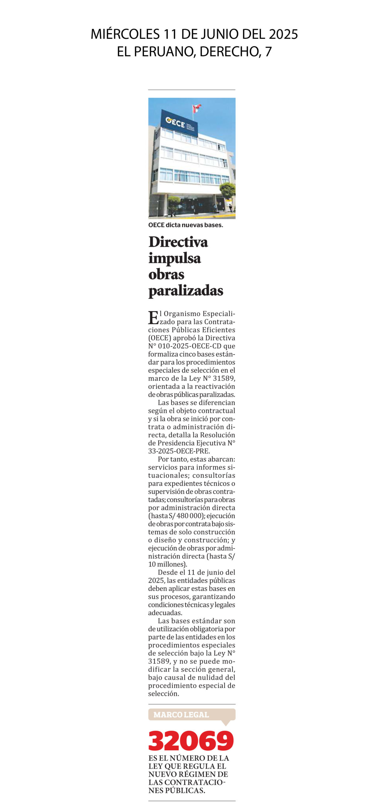 Directiva impulsa obras paralizadas El Organismo Especializado para las Contrataciones Públicas Eficientes (OECE) aprobó la Directiva N° 010-2025-OECE-CD que formaliza cinco bases estándar para los procedimientos especiales de selección en el marco de la Ley N° 31589, orientada a la reactivación de obras públicas paralizadas. Las bases se diferencian según el objeto contractual y si la obra se inició por contrata o administración directa, detalla la Resolución de Presidencia Ejecutiva N° 33-2025-OECE-PRE.