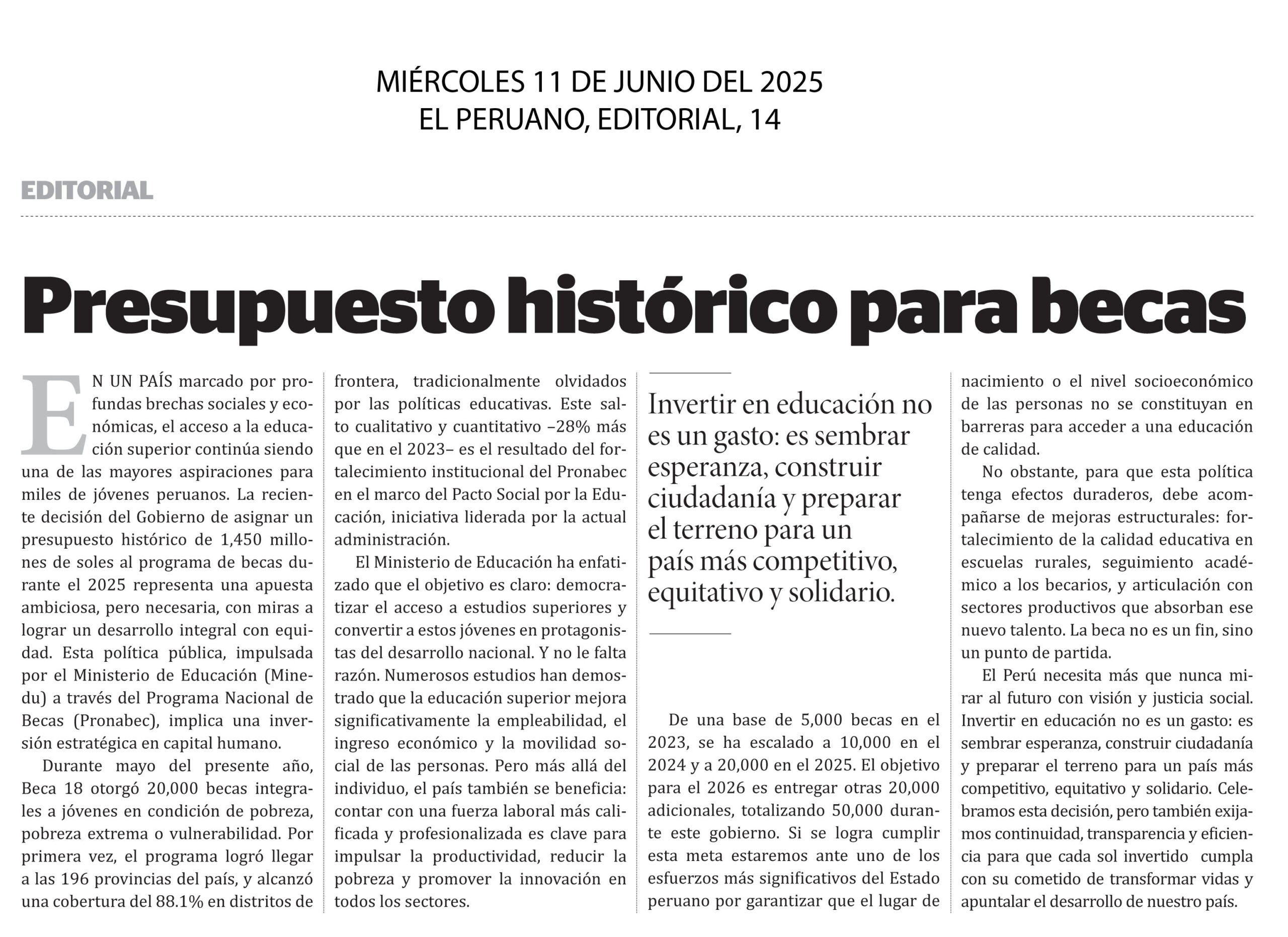 Presupuesto histórico para becas En un país marcado por profundas brechas sociales y económicas, el acceso a la educación superior continúa siendo una de las mayores aspiraciones para miles de jóvenes peruanos. La reciente decisión del Gobierno de asignar un presupuesto histórico de 1,450 millones de soles al programa de becas durante el 2025 representa una apuesta ambiciosa, pero necesaria, con miras a lograr un desarrollo integral con equidad. Esta política pública, impulsada por el Ministerio de Educación (Minedu) a través del Programa Nacional de Becas (Pronabec), implica una inversión estratégica en capital humano. Durante mayo del presente año, Beca 18 otorgó 20,000 becas integrales a jóvenes en condición de pobreza, pobreza extrema o vulnerabilidad. Por primera vez, el programa logró llegar a las 196 provincias del país, y alcanzó una cobertura del 88.1% en distritos de frontera, tradicionalmente olvidados por las políticas educativas.