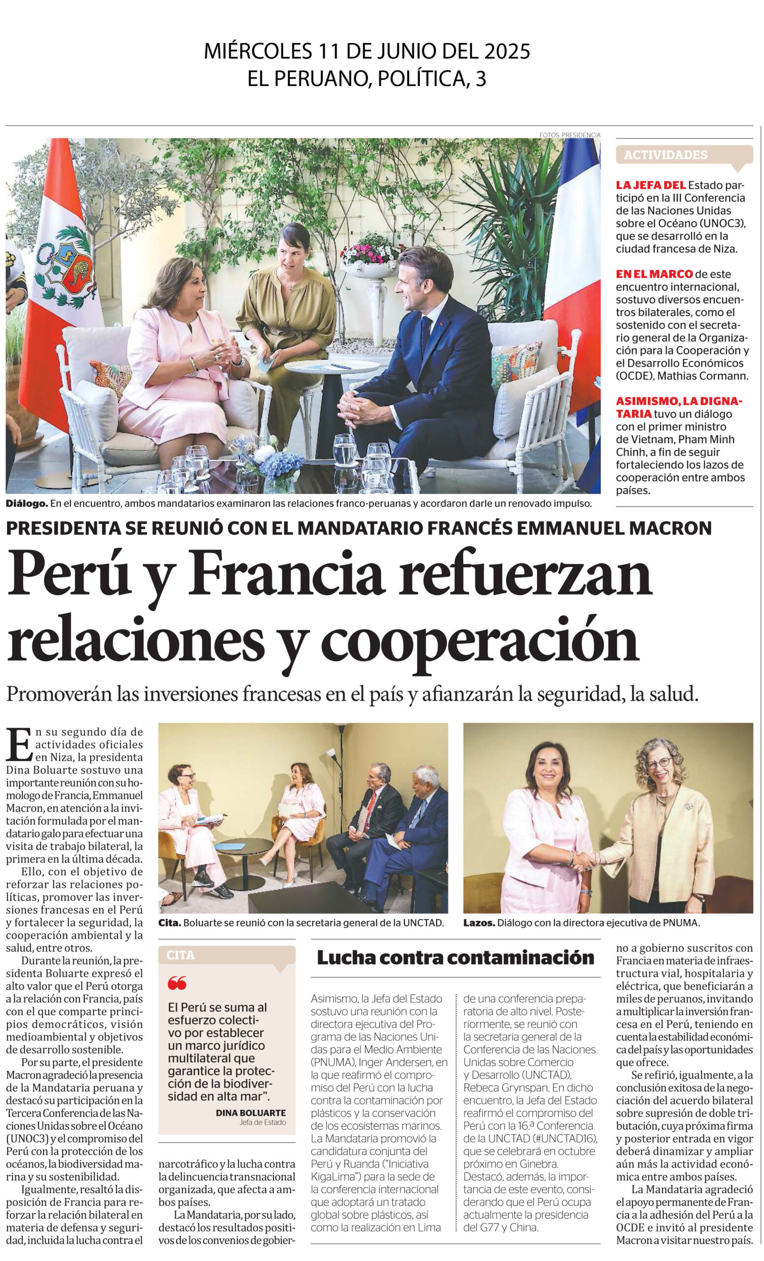 Perú y Francia refuerzan relaciones y cooperación En su segundo día de actividades oficiales en Niza, la presidenta Dina Boluarte sostuvo una importante reunión con su homólogo de Francia, Emmanuel Macron, en atención a la invitación formulada por el mandatario galo para efectuar una visita de trabajo bilateral, la primera en la última década. Ello, con el objetivo de reforzar las relaciones políticas, promover las inversiones francesas en el Perú y fortalecer la seguridad, la cooperación ambiental y la salud, entre otros. Durante la reunión, la presidenta Boluarte expresó el alto valor que el Perú otorga a la relación con Francia, país con el que comparte principios democráticos, visión medioambiental y objetivos de desarrollo sostenible.