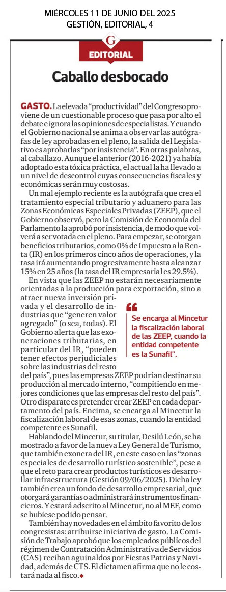 Caballo desbocado La elevada “productividad” del Congreso proviene de un cuestionable proceso que pasa por alto el debate e ignora las opiniones de especialistas. Y cuando el Gobierno nacional se anima a observar las autógrafas de ley aprobadas en el pleno, la salida del Legislativo es aprobarlas “por insistencia”. En otras palabras, al caballazo. Aunque el anterior (2016-2021) ya había adoptado esta tóxica práctica, el actual la ha llevado a un nivel de descontrol cuyas consecuencias fiscales y económica serán muy costosas. Un mal ejemplo reciente es la autógrafa que crea el tratamiento especial tributario y aduanero para las Zonas Económicas Especiales Privadas (ZEEP), que el Gobierno observó, pero la Comisión de Economía del parlamento la aprobó por insistencia, de modo que volverá a ser votada en el pleno. Para empezar, se otorgan beneficios tributarios, como 0% de Impuesto a la Renta (IR) en los primeros cinco años de operaciones, y la tasa irá aumentando progresivamente hasta alcanzar 15% en 25 años (la tasa del IR empresarial es 29.5%).