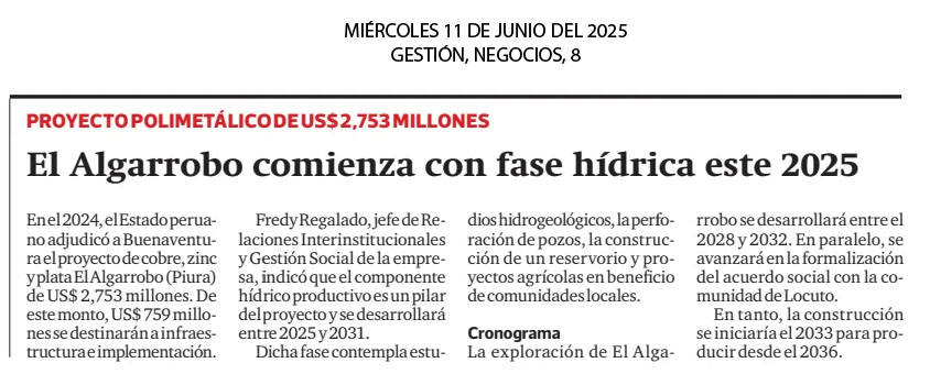 El Algarrobo comienza con fase hídrica este 2025 El Ministerio de Economía y Finanzas, a través de Proinversión, suscribió con Compañía de Minas Buenaventura el Contrato de Opción de Transferencia de Concesiones Mineras del Proyecto Hídrico Minero El Algarrobo, cuya primera etapa consiste en identificar fuentes de agua para mejorar el abastecimiento poblacional y actividades productivas en el centro poblado Locuto, Tambogrande, Piura. Gestión, Negocios, 8 |