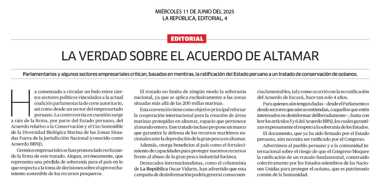 La verdad sobre el acuerdo de altamar Ha comenzado a circular un bulo entre ciertos sectores políticos vinculados a la actual coalición parlamentaria de corte autoritario, así como desde un sector del empresariado peruano. La controversia en cuestión surge a raíz de la firma, por parte del Estado peruano, del Acuerdo relativo a la Conservación y el Uso Sostenible de la Diversidad Biológica Marina de las Zonas Situadas Fuera de la Jurisdicción Nacional (conocido como Acuerdo BBNJ). Gremios empresariales se han pronunciado rechazando la firma de este tratado. Alegan, erróneamente, que representa una pérdida de soberanía para el país en lo que respecta a la toma de decisiones sobre el aprovechamiento sostenible de los recursos pesqueros. |