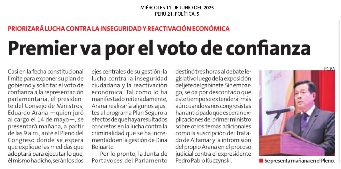 Premier va por el voto de confianza Casi en la fecha constitucional límite para exponer su plan de gobierno y solicitar el voto de confianza a la representación parlamentaria, el presidente del Consejo de Ministros, Eduardo Arana —quien juró al cargo el 14 de mayo—, se presentará mañana, a partir de las 9 a.m., ante el Pleno del Congreso donde se espera que explique las medidas que adoptará para ejecutar lo que, él mismo ha dicho, serán los dos ejes centrales de su gestión: la lucha contra la inseguridad ciudadana y la reactivación económica. Tal como lo ha manifestado reiteradamente, Arana realizaría algunos ajustes al programa Plan Seguro a efectos de que haya resultados concretos en la lucha contra la criminalidad que se ha incrementado en la gestión de Dina Boluarte.