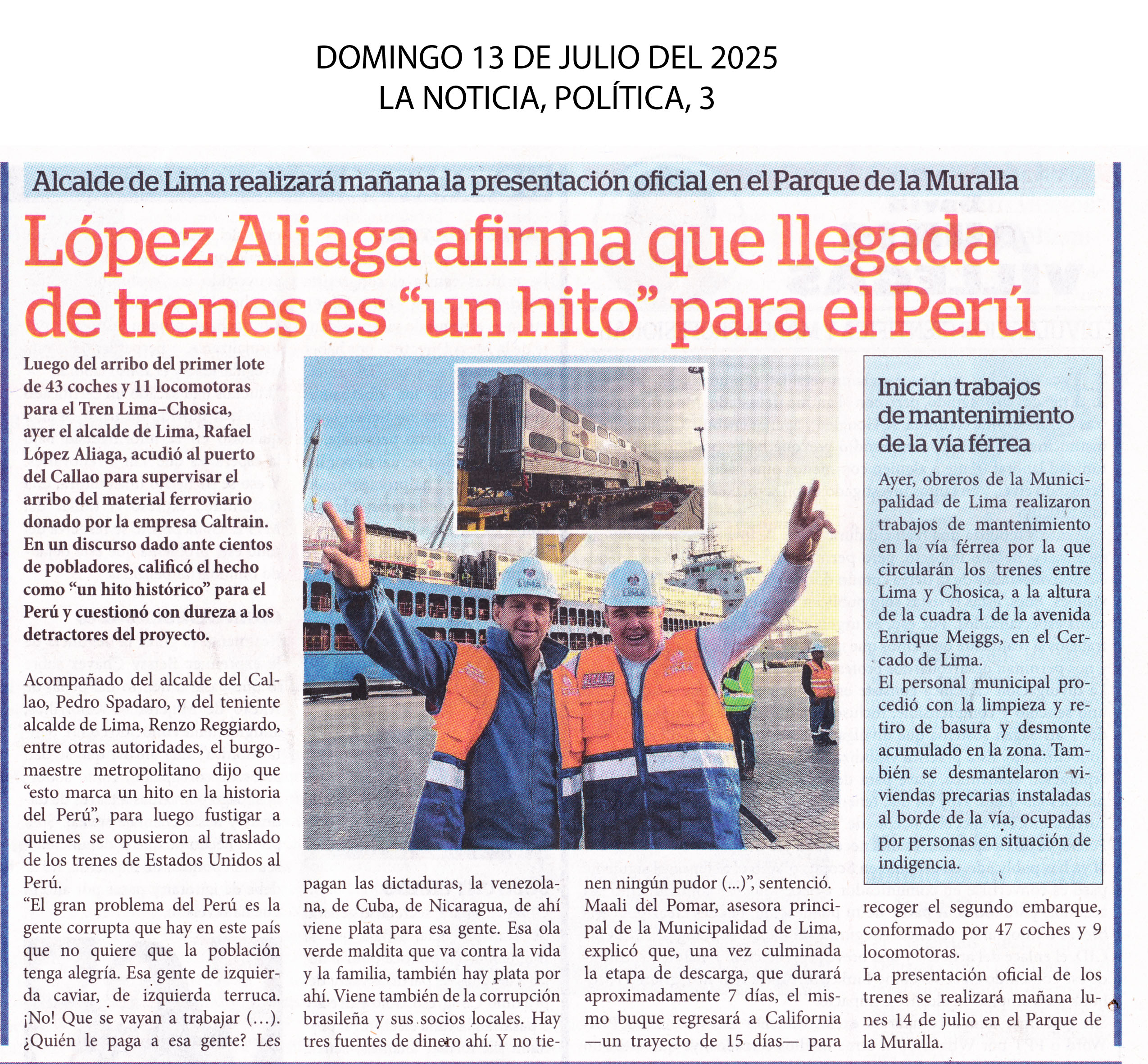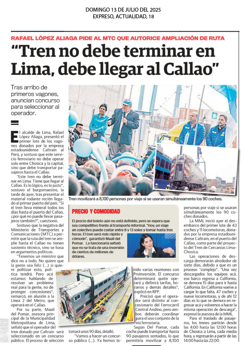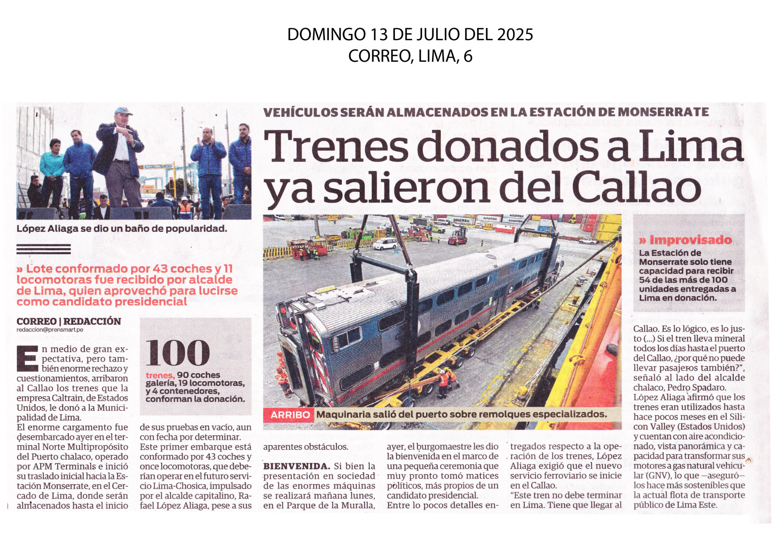 Los trenes que buscan conectar el Centro de Lima con el distrito de Chosica ya se encuentran en territorio nacional. El pasado viernes, la embarcación BBC Genoa arribó al puerto del Callao, y durante la madrugada y tarde de ayer, se llevó a cabo las descargas de los vagones, locomotoras y demás componentes en APM Terminals, también conocido como el puerto norte. Luego del desembarque, en la tarde, se realizó una ceremonia simbólica en las afueras de APM Terminals para formalizar la llegada del primer lote de trenes. Al evento asistieron el alcalde de Lima, Rafael López Aliaga; el alcalde del Callao, Pedro Spadaro; la congresista Norma Yarrow, entre otros funcionarios. "Propongo una marcha blanca con pasajeros, saliendo de Chosica hacia Desamparados y de ahí al Callao. Tres estaciones, un piloto para comenzar", declaró López Aliaga a Spadaro. No obstante, Maali Pomar, asesora de la Municipalidad de Lima, informó horas antes en entrevista con RPP que el MTC ha dispuesto que, en una primera etapa, el tren no llegará al Callao.