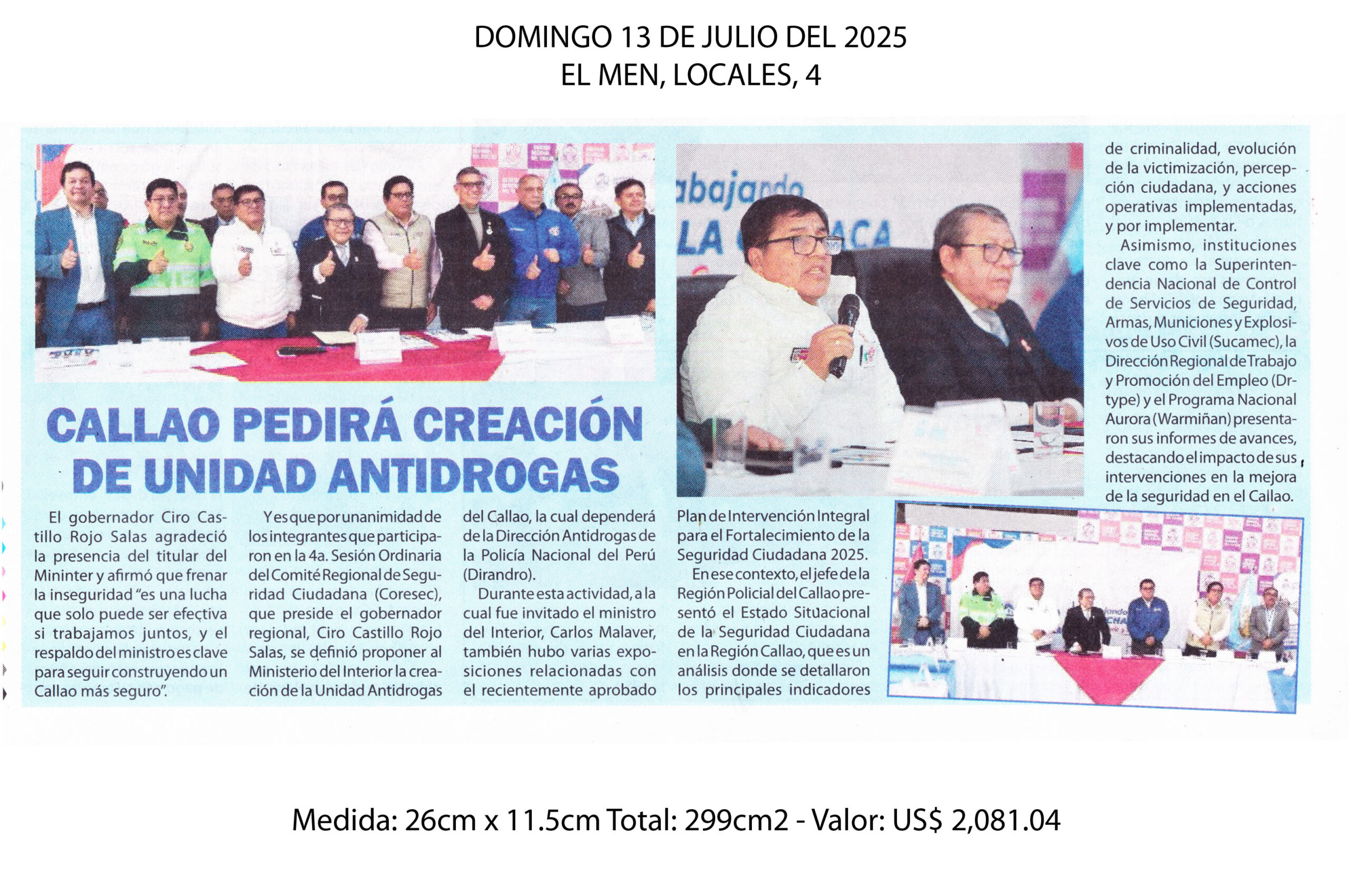 El gobernador Ciro Castillo Rojo Salas agradeció la presencia del titular del Mininter y afirmó que frenar la inseguridad “es una lucha que solo puede ser efectiva si trabajamos juntos, y el respaldo del ministro es clave para seguir construyendo un Callao más seguro”. Y es que por unanimidad de los integrantes que participaron en la 4a. Sesión Ordinaria del Comité Regional de Seguridad Ciudadana (Coresec), que preside el gobernador regional, Dr. Ciro Castillo Rojo Salas, se definió proponer al Ministerio del Interior la creación de la Unidad Antidrogas del Callao, la cual dependerá de la Dirección Antidrogas de la Policía Nacional del Perú (Dirandro).