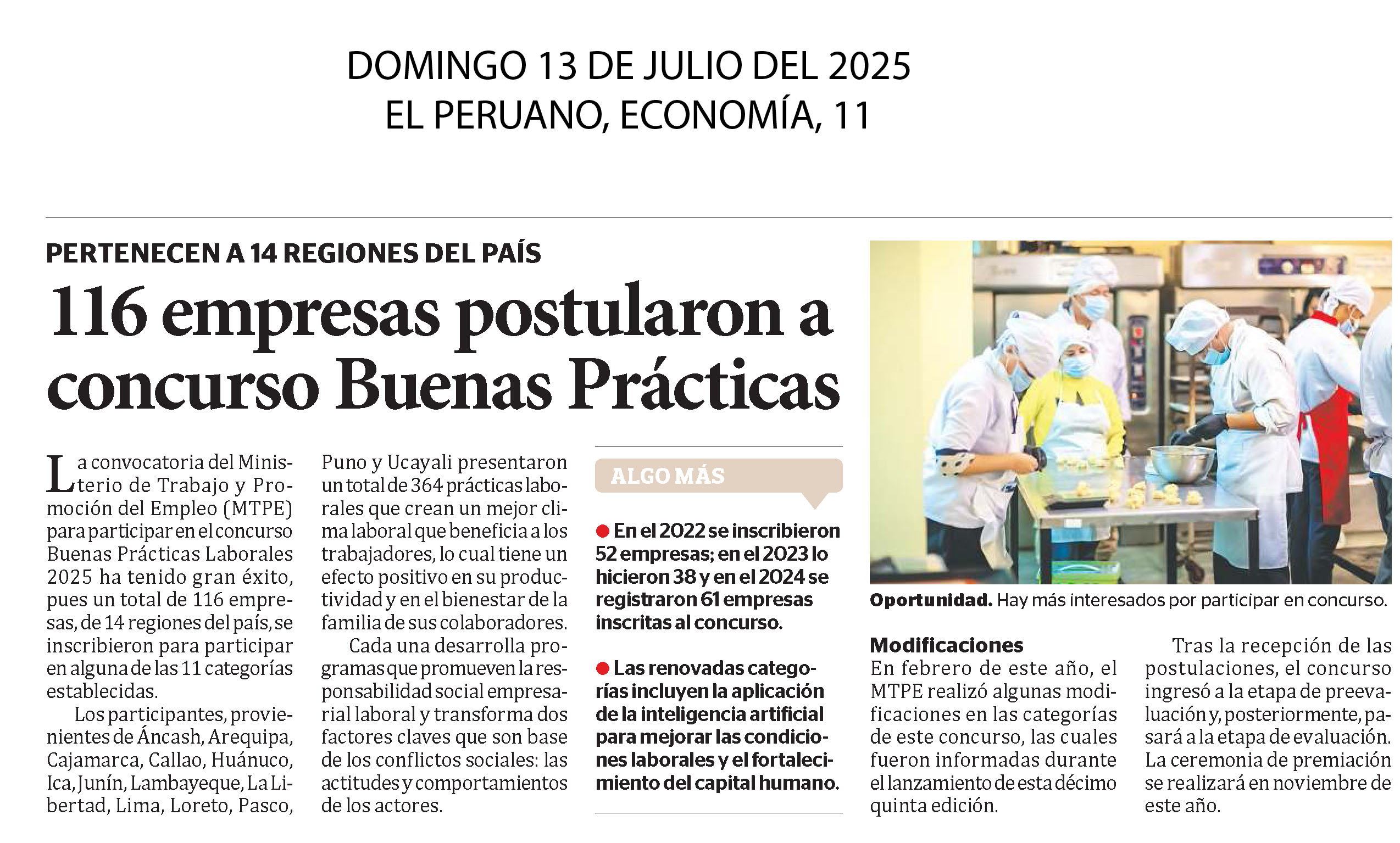 La convocatoria del Ministerio de Trabajo y Promoción del Empleo (MTPE) para participar en el concurso Buenas Prácticas Laborales 2025 ha tenido gran éxito, pues un total de 116 empresas, de 14 regiones del país, se inscribieron para participar en alguna de las 11 categorías establecidas. Los participantes, provienientes de Áncash, Arequipa, Cajamarca, Callao, Huánuco, Ica, Junín, Lambayeque, La Libertad, Lima, Loreto, Pasco Puno y Ucayali presentaron un total de 364 prácticas laborales que crean un mejor clima laboral que beneficia a los trabajadores, lo cual tiene un efecto positivo en su productividad y en el bienestar de la familia de sus colaboradores. Cada una desarrolla programas que promueven la responsabilidad social empresarial laboral y transforma dos factores claves que son base de los conflictos sociales: las actitudes y comportamientos de los actores.