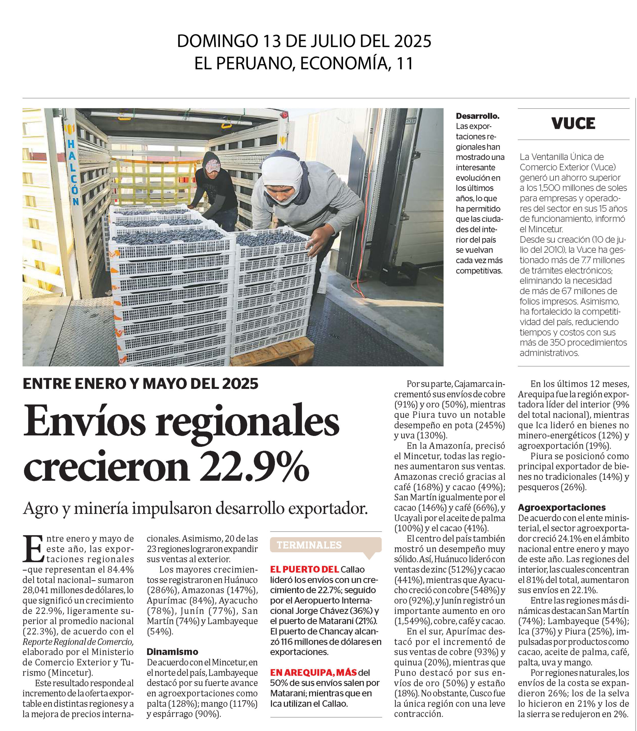 Entre enero y mayo de este año, las exportaciones regionales –que representan el 84.4% del total nacional– sumaron 28,041 millones de dólares, lo que significó un crecimiento de 22.9%, ligeramente superior al promedio nacional (22.3%), de acuerdo con el Reporte Regional de Comercio, elaborado por el Ministerio de Comercio Exterior y Turismo (Mincetur). Este resultado responde al incremento de la oferta exportable en distintas regiones y a la mejora de precios internacionales. Asimismo, 20 de las 23 regiones lograron expandir sus ventas al exterior. Los mayores crecimientos se registraron en Huánuco (286%), Amazonas (147%), Apurímac (84%), Ayacucho (78%), Junín (77%), San Martín (74%) y Lambayeque (54%).